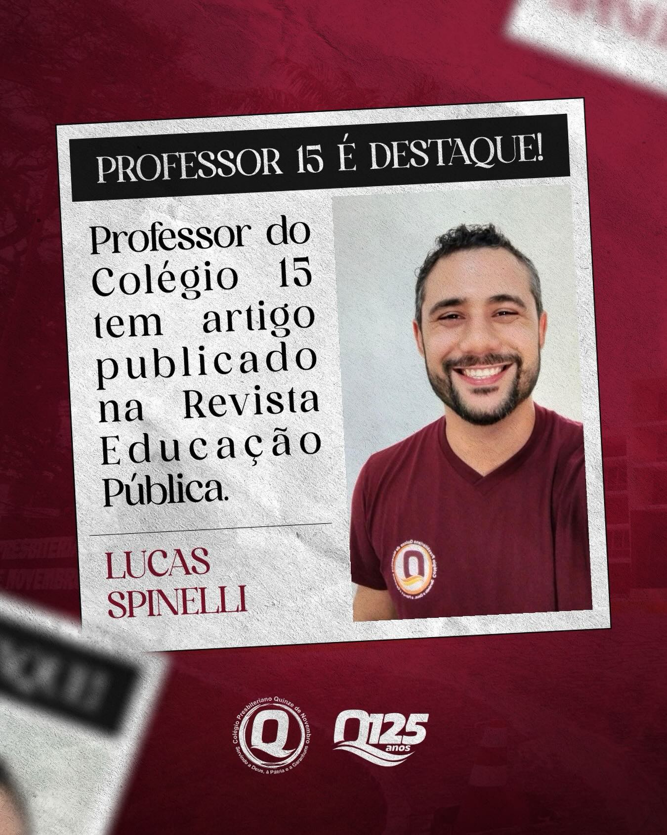 O Colégio 15 tem a satisfação de anunciar que o professor Lucas Spinelli, docente de Língua Inglesa da instituição, teve seu artigo científico publicado na Revista Educação Pública, periódico reconhecido nacionalmente pela relevância acadêmica.