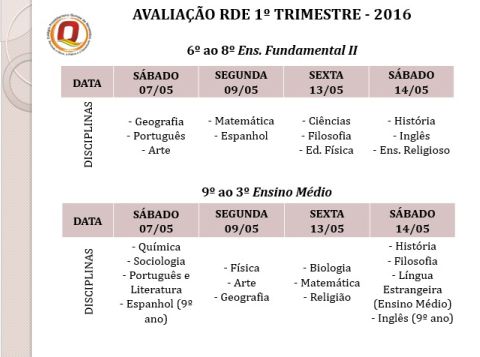 Estamos iniciando o período de RDE – Reconstrução do Desempenho Escolar, processo de avaliação em que há revisão de conteúdos trabalhados no trimestre, seguida de provas, cuja nota substituirá a menor nota do trimestre. Para que o processo aconteça de maneira significativa e cumpra sua finalidade, que é a ampliação da aprendizagem, precisamos de seu apoio. Assim, solicitamos atenção para as informações a seguir, imprescindíveis à dinâmica da RDE: