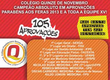 Colégio 15, campeão absoluto em aprovações. Parabéns aos feras 2013 e a toda a equipe XV!