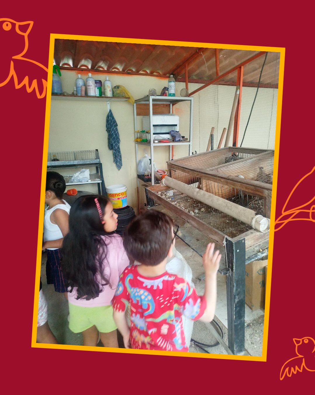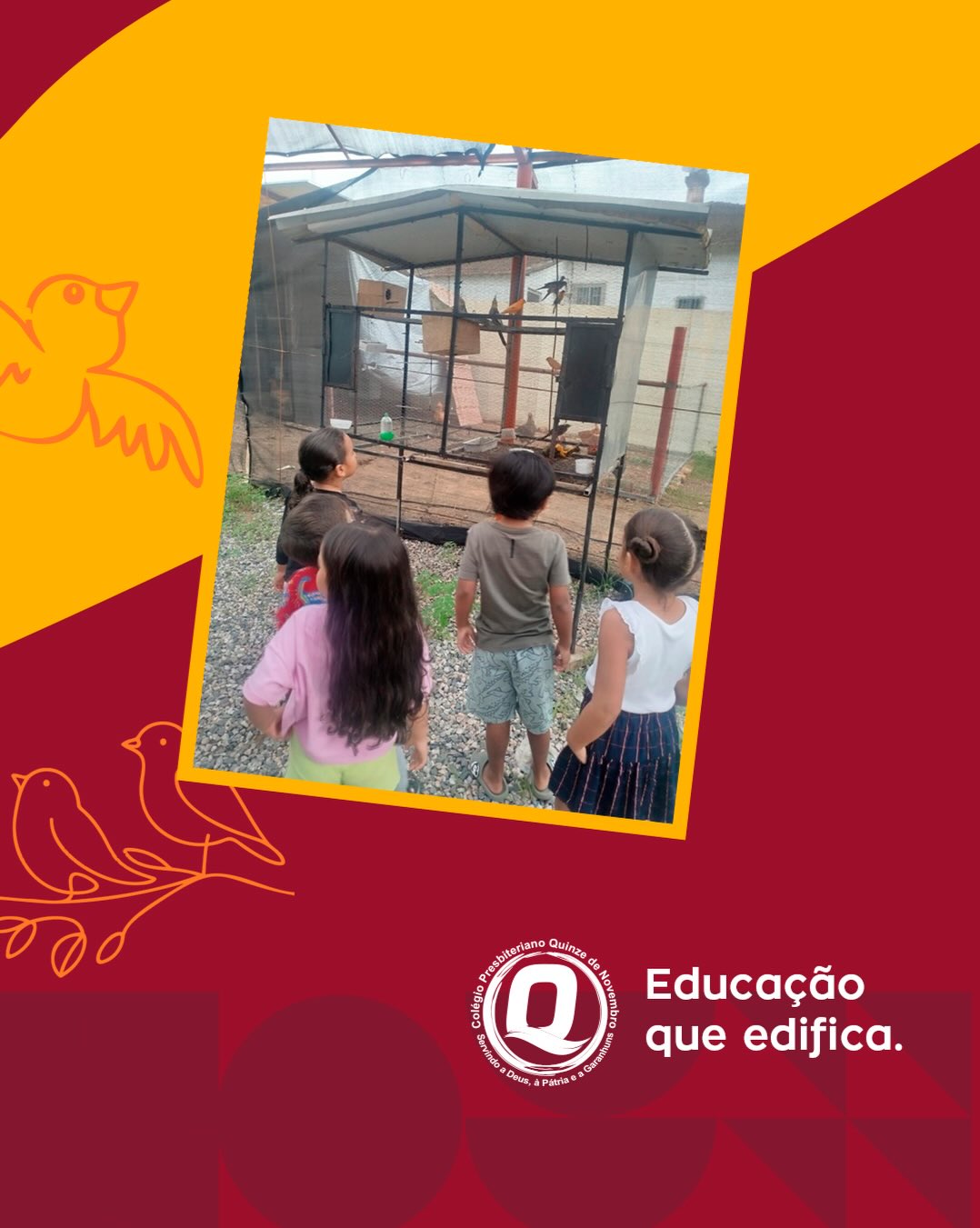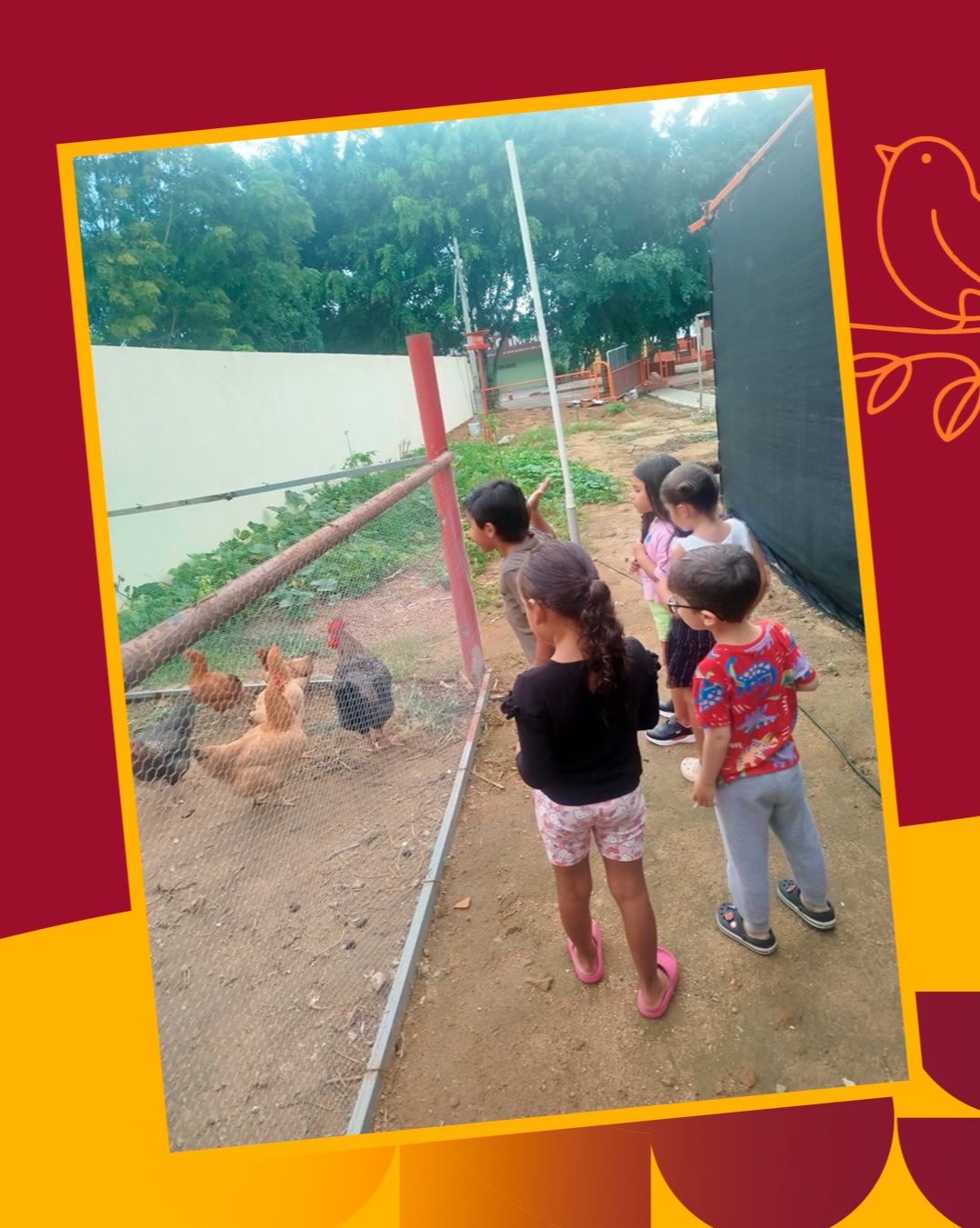 As crianças participam de uma visita ao aviário e à horta, com o objetivo de explorar, observar e descobrir elementos da natureza. Durante a atividade, elas conhecem de perto as codornas e os passarinhos, percebendo suas características, sons e modos de vida. Na horta, observam o crescimento das plantas, identificam diferentes verduras e compreendem a importância dos cuidados com a natureza.