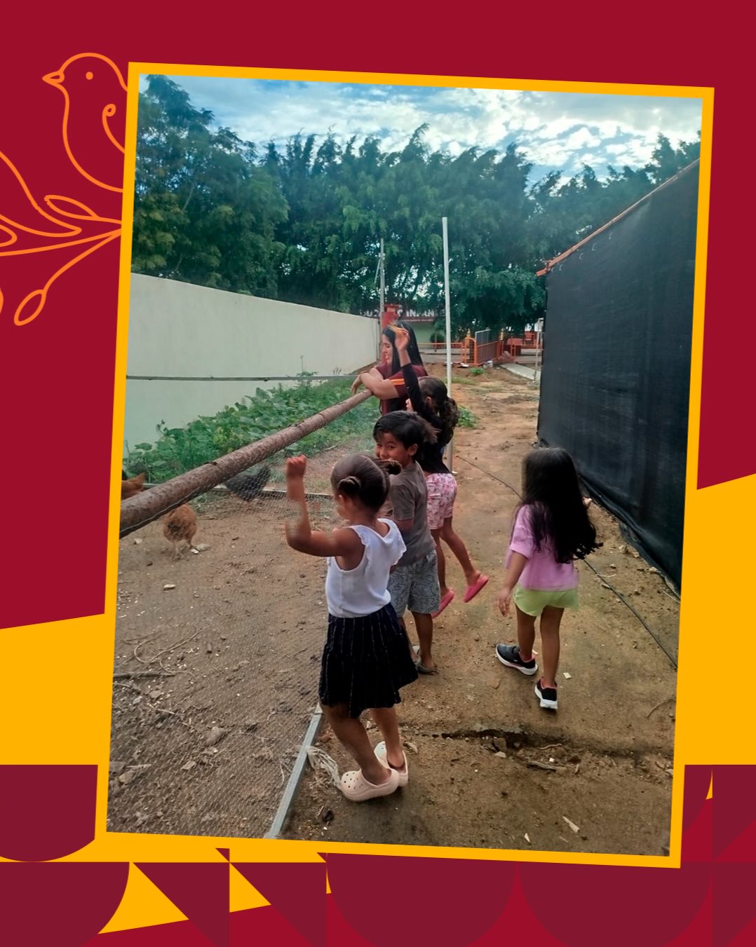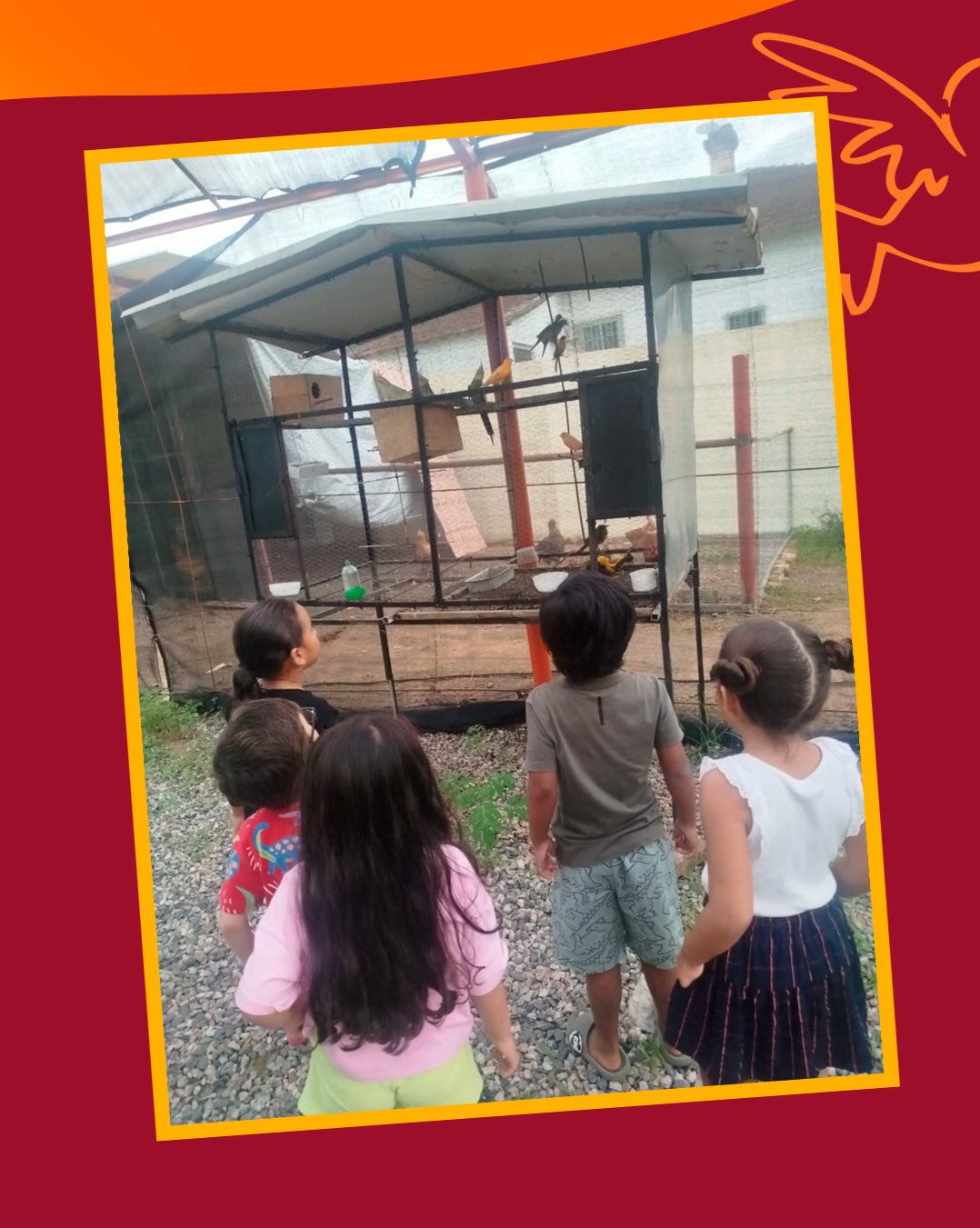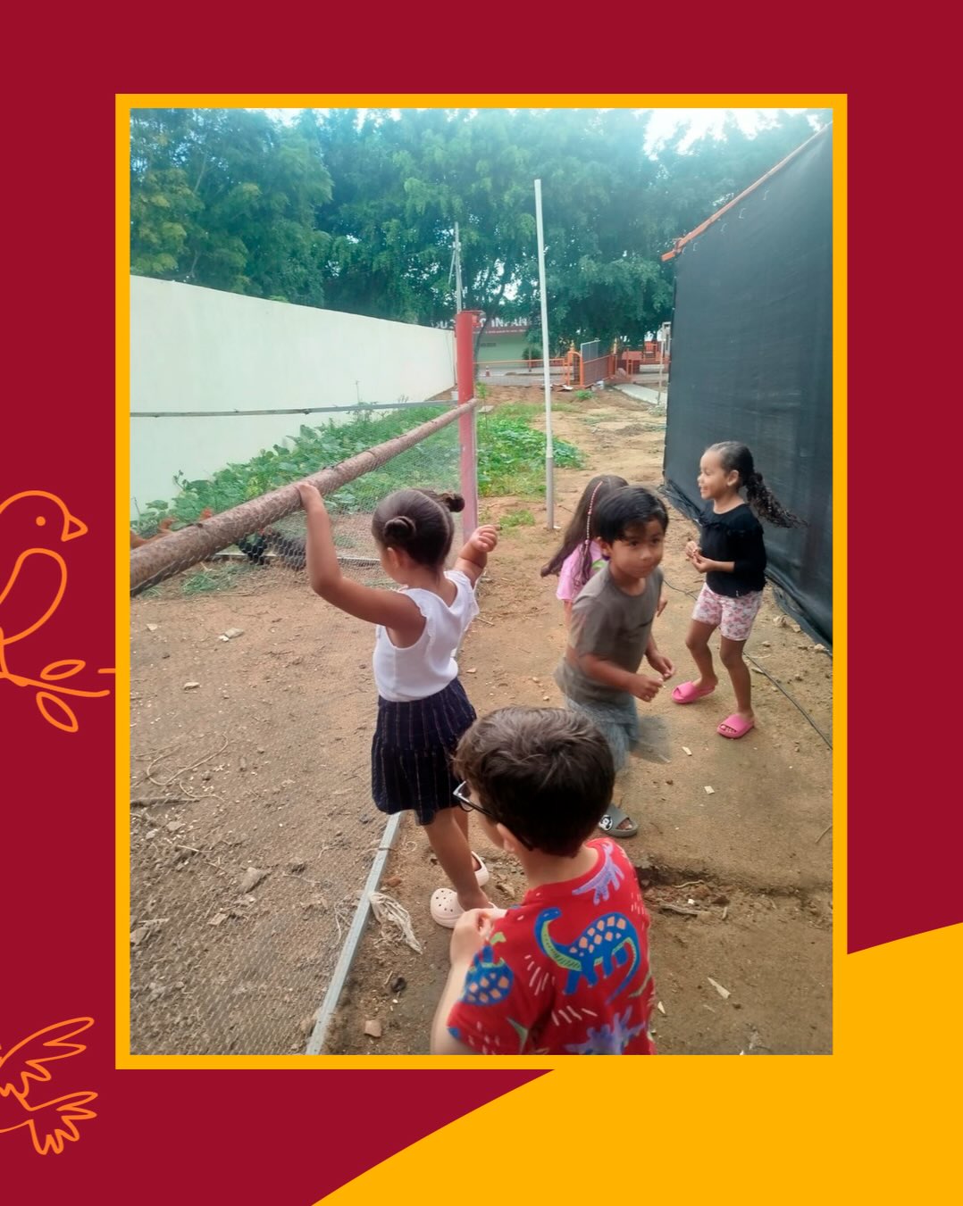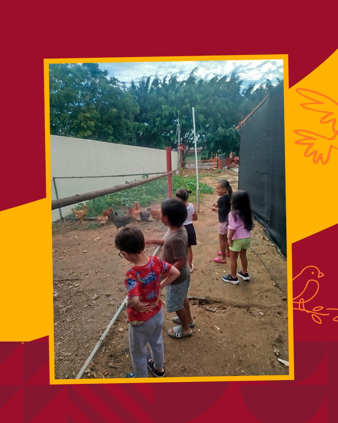 As crianças participam de uma visita ao aviário e à horta, com o objetivo de explorar, observar e descobrir elementos da natureza. Durante a atividade, elas conhecem de perto as codornas e os passarinhos, percebendo suas características, sons e modos de vida. Na horta, observam o crescimento das plantas, identificam diferentes verduras e compreendem a importância dos cuidados com a natureza.