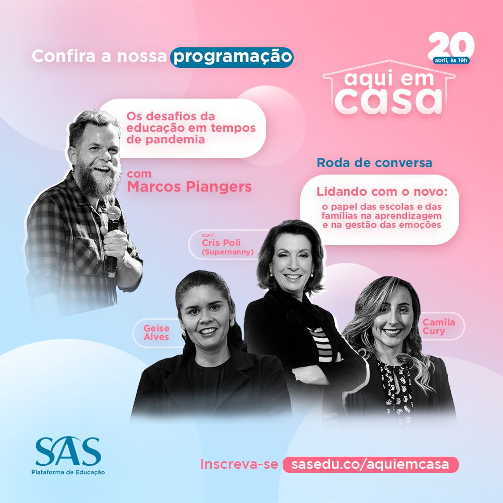 .Convidamos vocês para participarem dessa programação promovida pelo SAS, no projeto “Aqui em casa”. Dia 20 de abril, às 19h, haverá uma conversa com Cris Poli (A Supernanny), Marcos Piangers e Camila Cury, que vão tratar dos desafios de lidar com a educação dos filhos e com a gestão das emoções nesse período tão conturbado pelo qual passamos. Mesmo que você não tenha acesso oficial à Plataforma SAS, pode participar.