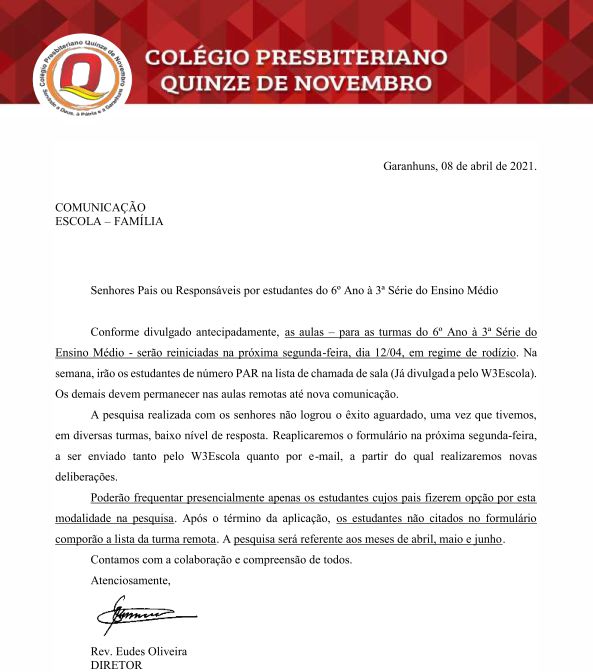 Reinício das aulas presenciais em 12 de abril - Fundamental Anos Finais e Ensino Médio