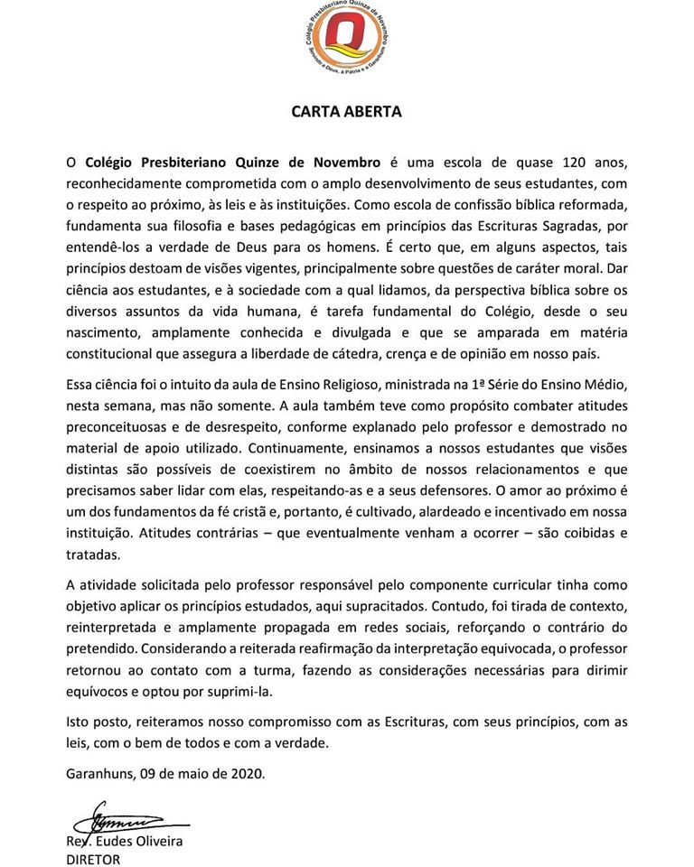 Carta aberta do Colégio Presbiteriano Quinze de Novembro