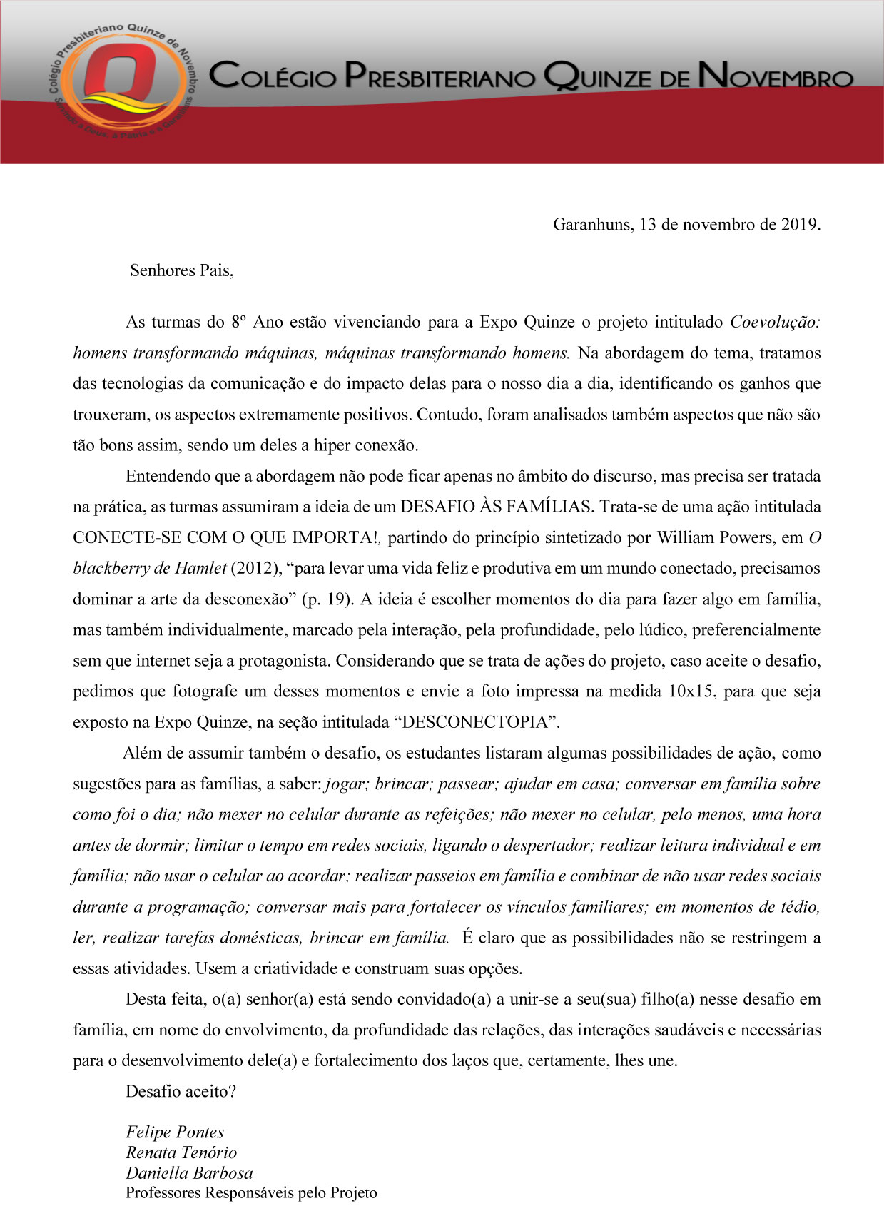 Carta aos pais do 8º Ano