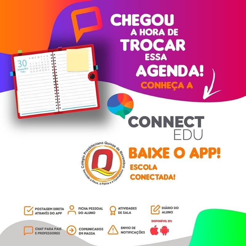 Os papais e mamães do Colégio Quinze podem acompanhar o dia a dia de seus filhos na escola! Baixe agora mesmo o Connect Edu na loja do seu aparelho celular. Está disponível tanto na App Store quanto na Google Play.So clicar nos links abaixo.