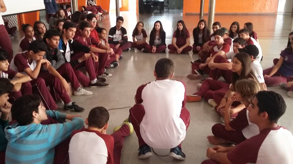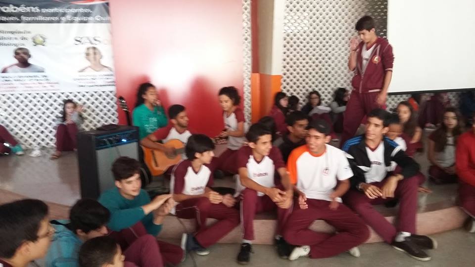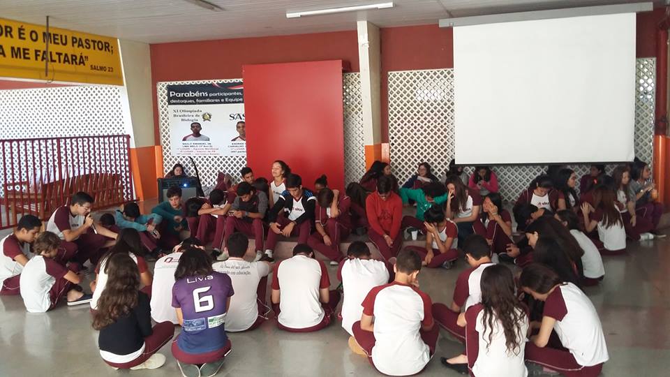 Esse é um pouquinho do INTERVALO BÍBLICO. Todas as quintas-feiras adolescentes se reúnem, voluntariamente, no pátio do Ensino Médio para conversar sobre temas que dizem respeito à sua realidade, abordando-os numa perspectiva bíblica. Além de conversa, há dinâmicas, oração e cânticos de louvor a Deus, tudo conduzido por eles mesmos, sob a coordenação da Capelania do Colégio. É um trabalho que nos emociona.