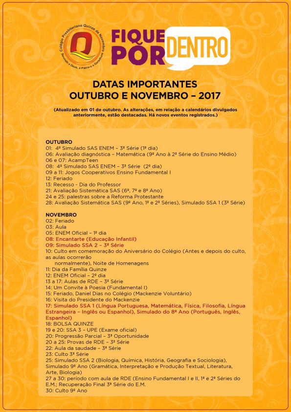 DATAS IMPORTANTES - OUTUBRO E NOVEMBRO 2017