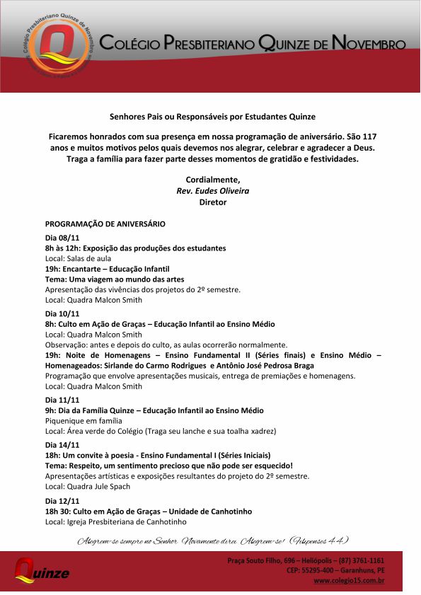 Senhores Pais ou Responsáveis por Estudantes Quinze
