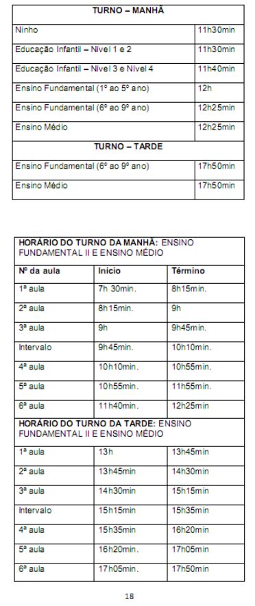 O horário de saída dos estudantes obedecerá ao número de aulas fixadas para aquele dia, bem como ao nível de ensino em que está matriculado, conforme quadro: